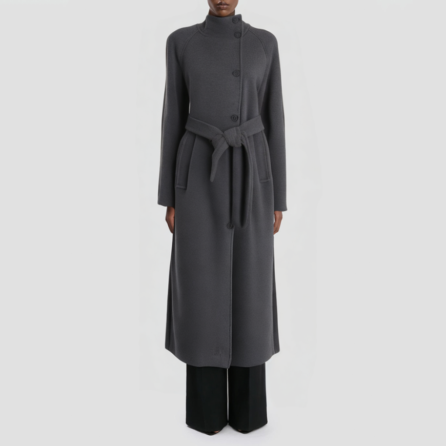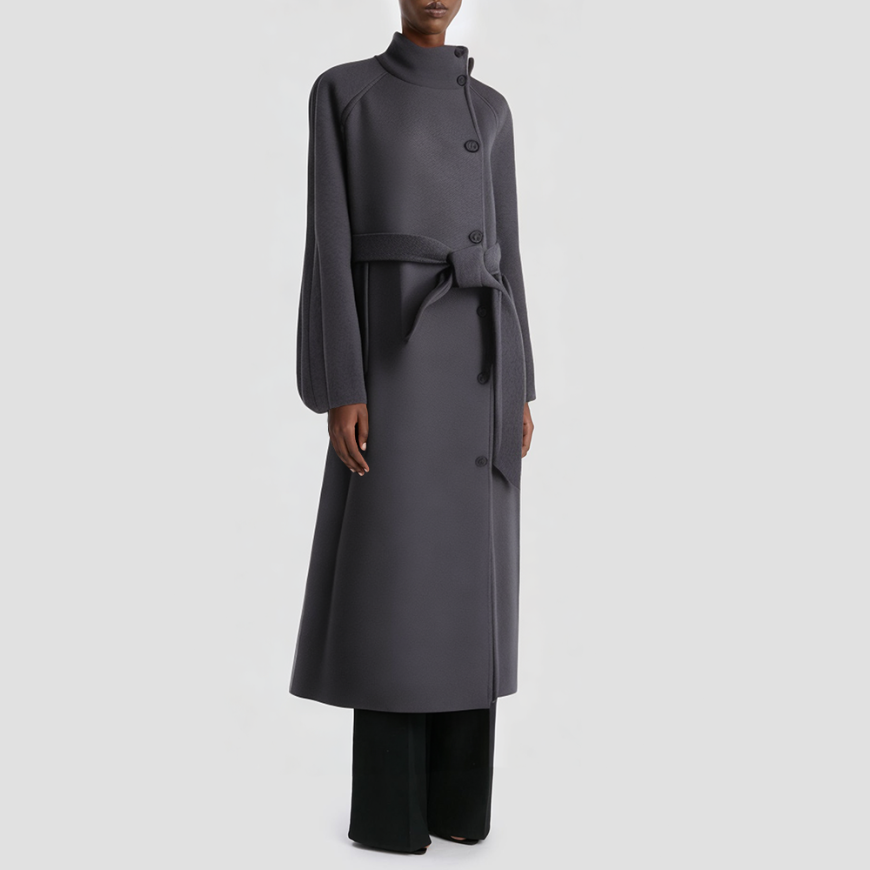 This coat blends vintage and contemporary elements, featuring a Chinese-style stand-up collar that accentuates a distinctive and elegant aesthetic. Its long, relaxed silhouette is perfect for autumn wear, balancing comfort with everyday practicality. The single-button placket ensures easy wear, while the adjustable waist belt effortlessly defines the waistline and adds dimensional layering to the look. Practical front pockets provide convenient storage for essentials. The clean, understated design makes it versatile for casual outings, commuting, or everyday wear.