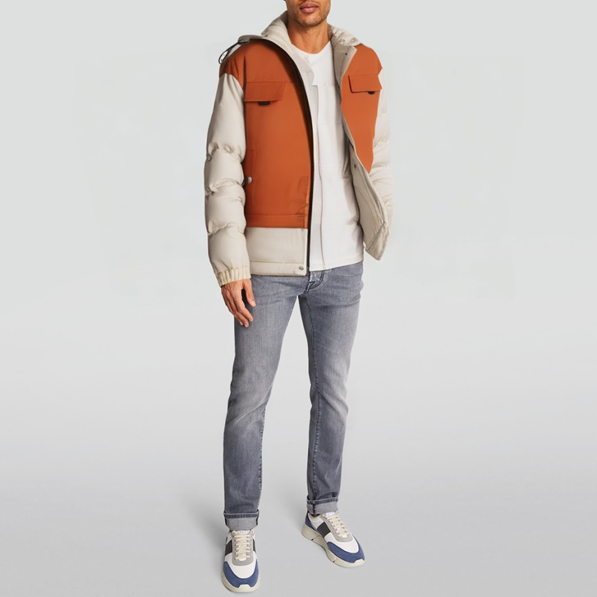 This jacket is specifically designed for winter outdoor activities, combining warmth with a fashionable aesthetic. Featuring a color-blocked design, it exudes a modern and sporty vibe, effortlessly pairing with various winter outfits. The hooded design effectively blocks wind and cold, while the zippered placket allows for easy on/off and enhances protection. Crafted from combed silk fabric, the jacket offers a soft, smooth feel, while the crochet construction enhances durability and comfort. Filled with high-quality down (150g-200g fill power), it delivers exceptional warmth with a lightweight, lofted feel while maintaining breathability. The versatile pocket design is both practical for storing essentials and adds to the overall stylish appeal.