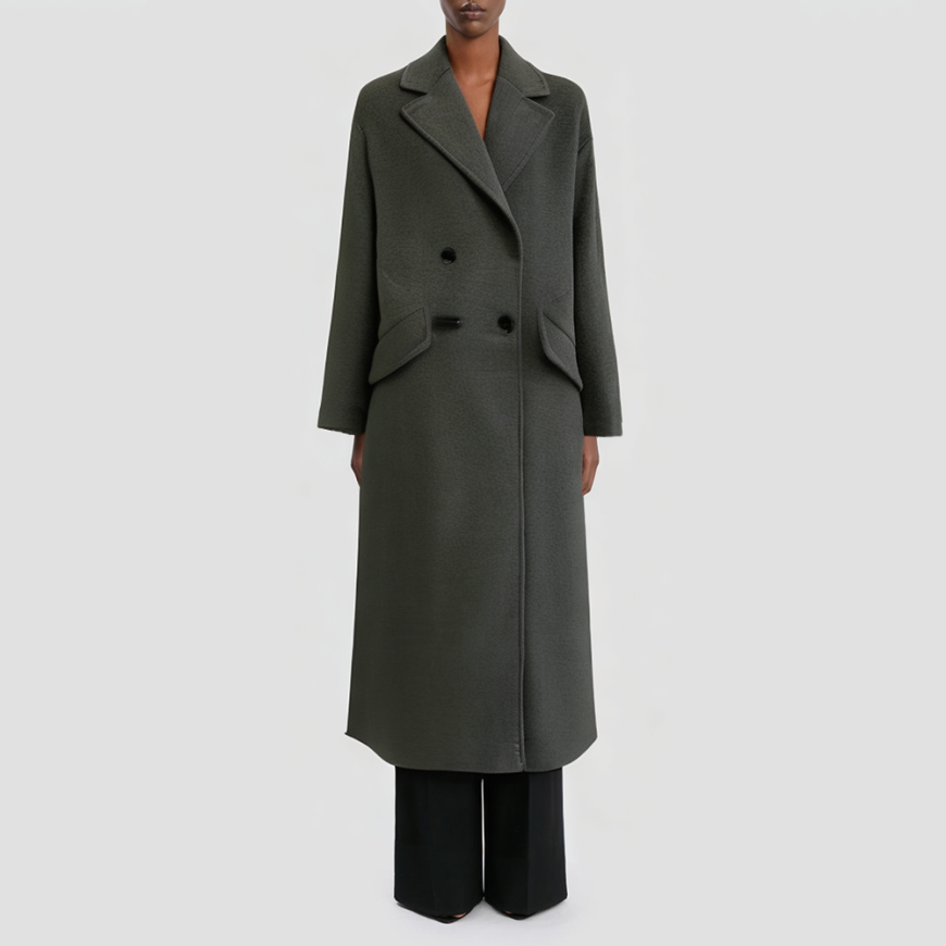 This coat features a classic double-breasted front closure and a vintage-inspired lapel design. Its relaxed, generous silhouette ensures comfortable, unrestricted wear. Regular-fit long sleeves are paired with patch pockets for both practicality and style, making it ideal for winter commutes and everyday outings. A cotton lining enhances warmth inside the coat. Knitted construction combined with dyeing techniques creates a naturally refined texture, resulting in an elegant and timeless style suitable for various body types and styling needs.