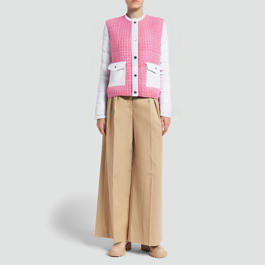 This jacket features a high-quality nylon shell that is lightweight, durable, and highly windproof. The interior is filled with goose down in a moderate amount, ensuring comfort and warmth while maintaining a lightweight feel. The sailor-style round neck offers a clean, sophisticated look, while the regular sleeves follow the natural contours of the arms for a comfortable, relaxed fit. Tweed panels on the body add visual dimension, and the single-button placket with front pockets provides convenient storage, blending practicality with style. The overall cropped cut is sharp and clean, making it perfect for winter leisure, travel, and everyday styling.